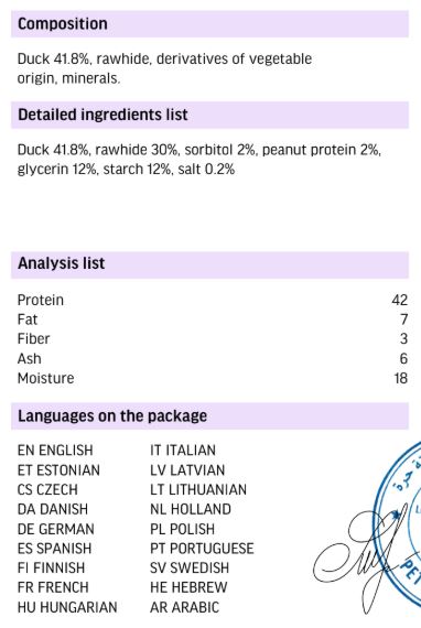 Duck 41.8%, rawhide 30%, sorbitol 2%, peanut protein 2%,
