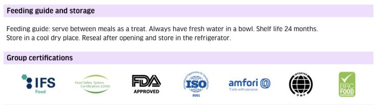 Feeding guide: serve between meals as a treat. Always have fresh water in a bowl. Shelf life 24 months.